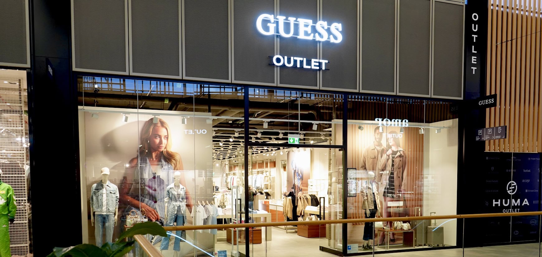The redesigned exterior façade of HUMA WELT draws visitors' attention to the outlet with significant advertising motifs and an eye-catching color scheme. Special signage concepts, illuminated lettering and innovative design elements in the center as well as in the parking garages guide smart shoppers to the urban outlet level.